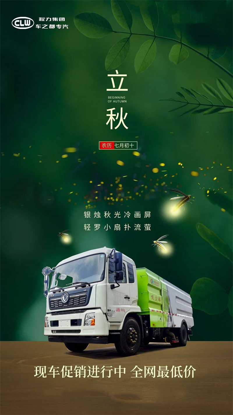 立秋了,程力集團(tuán)環(huán)衛(wèi)車廠家希望秋天的風(fēng),可以吹走夏日所有的遺憾,希望這個(gè)秋天,可以帶來很多好消息,所有的努力都有好的結(jié)果,所有的付出都有好的收獲。程力汽車環(huán)衛(wèi)車促銷進(jìn)行中,全網(wǎng)最低價(jià)。
