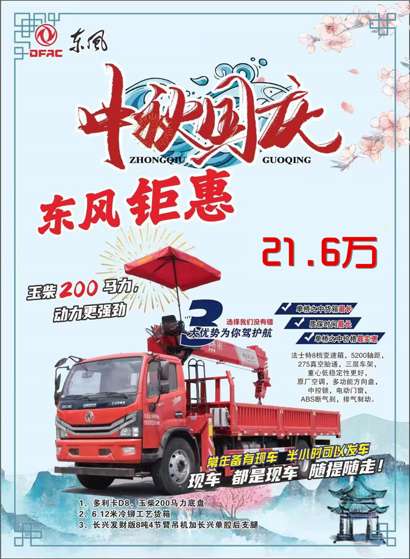 國慶特惠程力汽車自10月1日起至12月31日,凡是在我公司訂購【東風天錦,天龍系列隨車吊整車】即可享受最高3萬元補貼,具體車型聯系18672220111李經理尊想好政策。