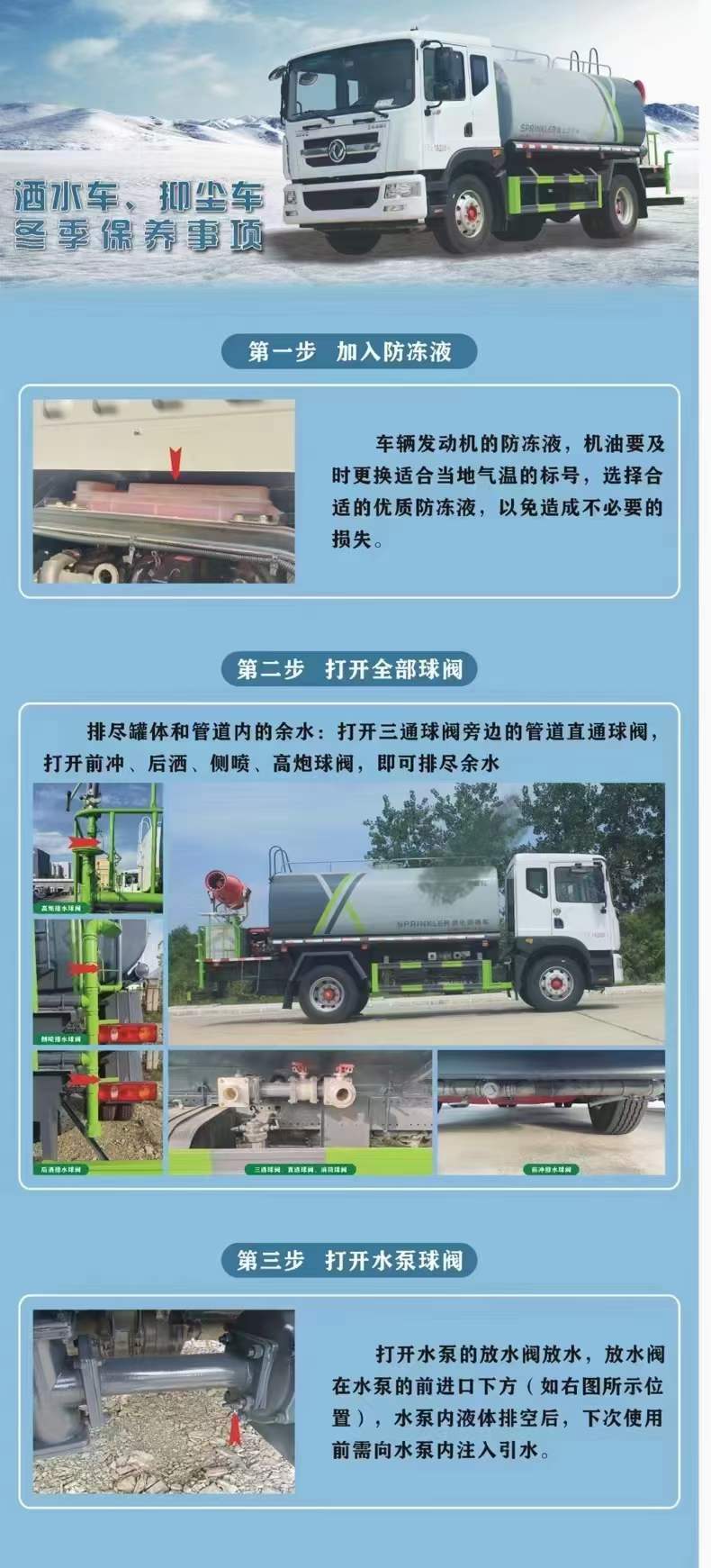 當氣?溫低于?零度時,應及時?打開灑水車所有管道閥門,排盡灑水車?體及管道?余水,并使球閥保護打開狀態,防止?管道、球閥凍?裂。