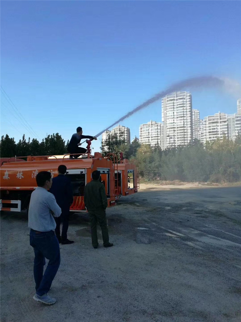 該車安裝了后置式消防泵,工作壓力在1.0 Mpa,在發生為災時啟動消防泵,關閉灑水功能閥門,操作消防炮,射程達45米以上,消防炮流量大,射程遠,即可滅火。同時該車安裝了前沖、后灑,后置工作平臺,工作平臺安裝了灑水,用作綠化灑水功能時運行消防泵,關閉消防炮,打開前沖閥門,可沖洗路面,同時可后灑水部分可灑水降塵,另工作平臺灑水射程30米以上,可調成柱狀、霧狀和開花狀,可澆樹澆花等。