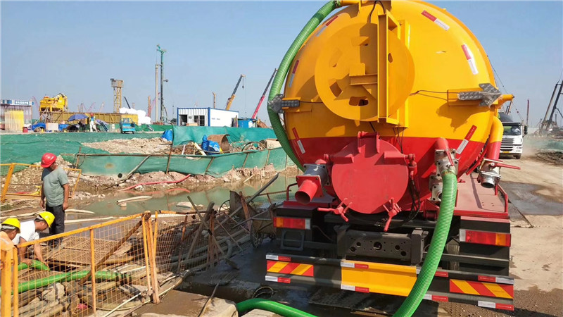 該吸污車吸污時有發動機取力器或者付發動機帶動真空泵,抽空污體罐中空氣使罐內氣壓低于外部大氣壓,污物受外部氣壓壓力經吸糞膠管進入污體罐中。真空吸污泵垂直吸程可到10-12米,3到5分鐘可以抽滿一罐。污體罐裝滿后可通過加壓通過污水口排出,也可通過罐體舉升,罐體后蓋液壓開啟直接排出。