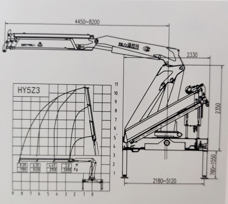 最大起吊重量5噸,最大工作半徑7.9米,最大舉升高度8.7米;工作半徑3.4米舉升高度4.5米,起吊重量2.4噸;工作半徑5.7米舉升高度6.5米,起吊重量1.2噸;工作半徑7.9米舉吊高度8.7米,起吊重量800kg。