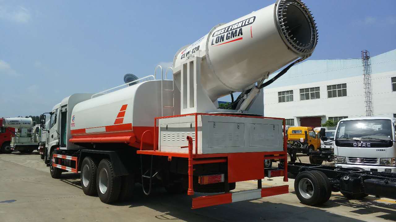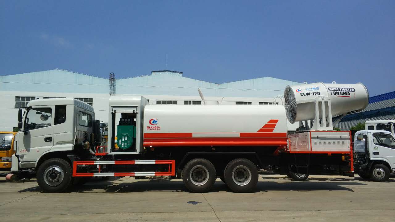 1、基本配置:水罐容積16立方米、常規最大配備CLW-120噴霧炮射程達90-100米、配套100KW汽油發電機、前沖后灑、側噴、平臺高炮、自流閥及消防接頭各1個、水管2根、8T以上高位花灑2個,標配億豐泵或金龍泵。