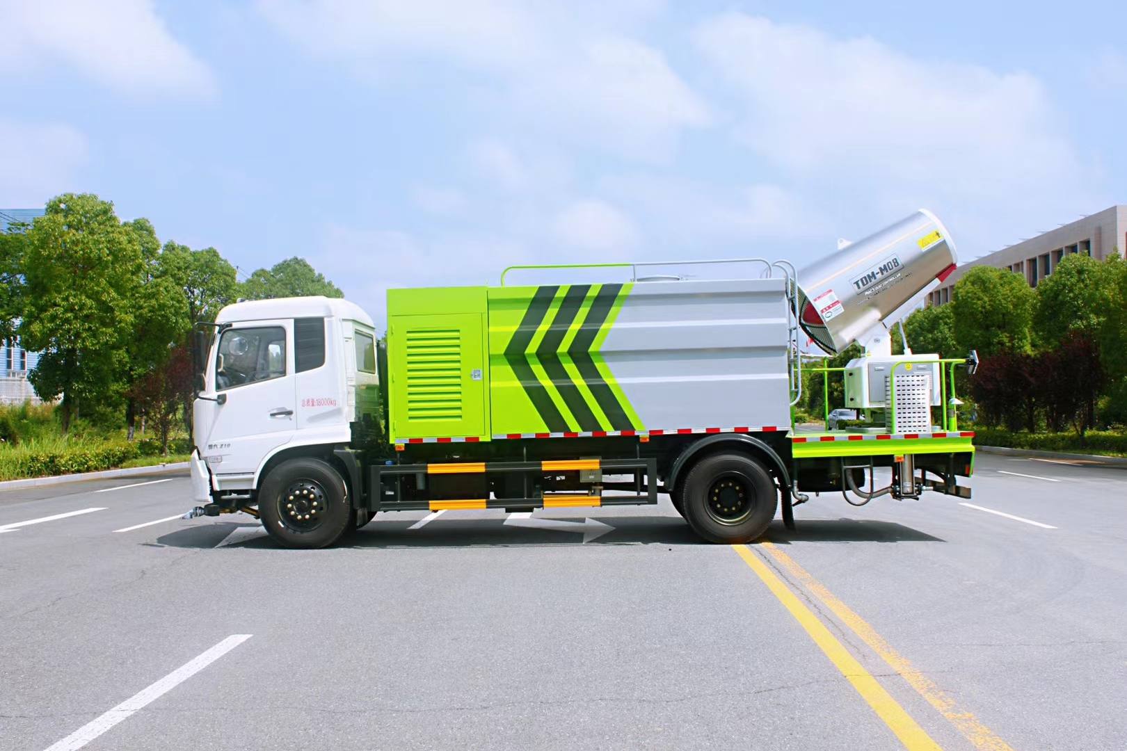 罐體滿載容積10-14立方,前噴,后灑,側噴,高炮,帶工作平臺,平臺加裝60/80/100/120米風送式霧炮,前沖、后灑氣動閥駕駛室自動控制,(采用氣動球閥優勢:1.操作方便,能及時避讓行人及特殊情況。2.避免車輛停止狀態水資源被隨意流失浪費。3.由于前沖后灑管道離地低,方便后期罐體無泄漏維修)。標配50/110大功率專用水泵,具有自吸自排功能,主管道加粗至前后三通使灑水出水量大、工作壓力效果更好,罐體內環氧玻璃鱗片防腐處理(質保兩年)配備柴油發電機組,霧炮可作為噴射農藥,抑塵功能。