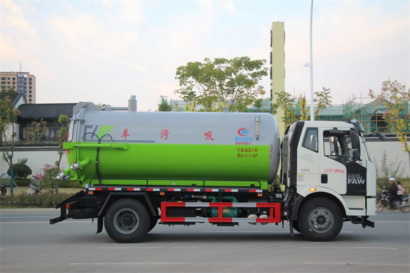 一汽解放吸污車上裝:罐體容積13方,國標武鋼6MM厚。罐體液壓舉升,后蓋液壓開啟,億豐SK-12水循環泵。