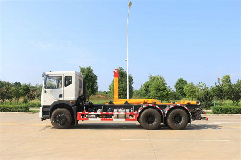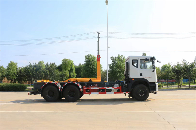 L型勾臂架分中帶伸縮拉譬、主譬油缸、活動套譬、套譬油缸、附車架、翻轉架、支撐腿、鎖緊架、鎖緊油缸及多路換向閥等組成。拉臂帶伸縮功能,可以通過改變力矩和加大壓力的方式拉升更大的重量,配備垃圾斗后適合裝載建筑垃圾等重物 液壓泵為合肥皖液、多路閥、液壓鎖、平衡閥、行程閥、無線遙控器,采用威森博樂,油缸為定制頂尖合資威森博樂品牌,其余標配。