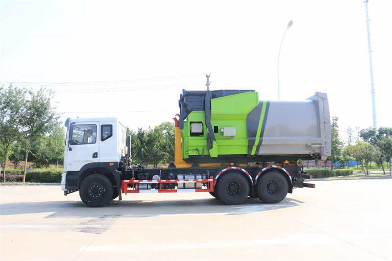 2、上裝配置:上裝勾臂式結構,可將垃圾箱放于地面,廂體厚度邊板4個厚,底板5個厚,上面廂體頂部可翼展飛開,方便污泥裝運,廂體后蓋可打開(帶上下雙鎖緊油缸),廂體后部有密封圈實封,防止裝卸、運輸過程中無二次污染。廂體尺寸是:5.2米長,2.5米寬, 1.4米高,總容積18立方(廂體尺寸供參考,保證總容積18立方)