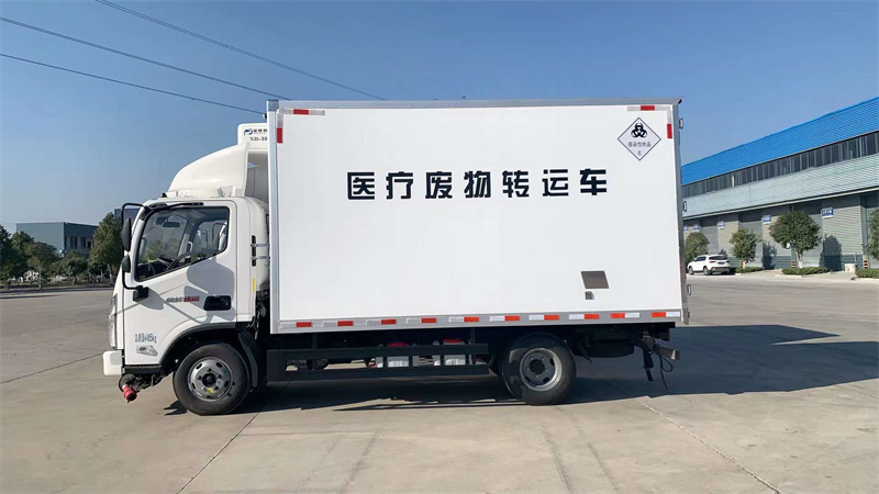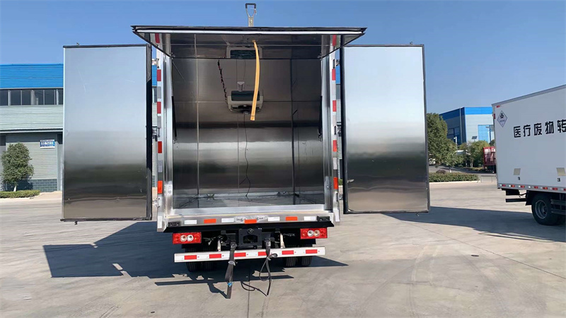 醫療廢物轉運車上裝配置:外板采用玻璃鋼,中間填充隔熱阻燃材料,廂內全部為不銹鋼內板,尾部帶不銹鋼門內門(選裝側門),帶-5度冷藏機組。