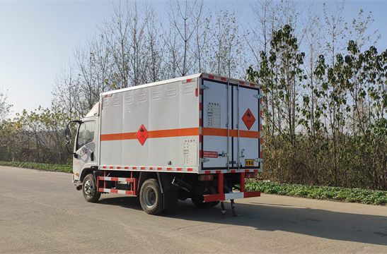 外板采用免漆板及一次性沖壓成型具有防雨功能的通風窗,貨廂內蒙皮采用合金板有透氣孔,復合加鉚合工藝,內襯為矩形管骨架牢靠穩定,貨廂面板內外蒙皮之間采用阻燃隔熱材料填充,廂體外部四周鋁合金型材包邊,底板和車廂前下部鋪橡膠皮,后門雙開,可選開側門,內部裝固定貨物的臥環或護板,安裝煙霧報警器、防盜感應器。車身附件靜電接地帶、滅火器、防火罩、危險品三角燈、橙色反光帶、CCC反射器、菱形標志牌、危險品牌、安全告示齊全。