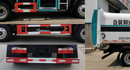 1.該車主要用于垃圾收集轉運,專用裝置為垃圾箱及提升機裝置;2.隨底盤選裝駕駛室,整車外形尺寸長/軸距/后懸(mm)對應關系為:5400/2700/1645,5700/2950/1695,5995/3308/1632.3.防護材料:Q235B碳鋼,連接方式:左右側面防護與副梁均采用焊接連接,后下部防護與車架采用焊接連接,后部防護斷面尺寸(mm):120×50,后部防護離地高度(mm):390;4.ABS型號/廠家:ABS/ASR-12V-4S/4M/襄陽東風隆誠機械有限責任公司;5.發動機與油耗值(L/100km)的對應關系為:CY4BK161/11.4,CY4BK461/11.4,ZD30D16-6N/11.4,CA4DB1-11E6/11.4,YCY24140-60/11.4,D20TCIF1/11.4,Q23-115E60/11.4,H20-120E60/11.4,CA4DB1-13E6/11.4.
