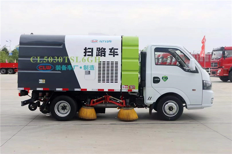 該款藍牌掃路車整車型號為CL5030TSL6GM型程力牌掃路車主要配置:柳汽112馬力,帶掃盤 4 把,云內 57馬力 副發動機,力沃馬達,施耐德控制開關,海普瑞斯電磁閥組, 免維護自動分離式離合器,免維護風機,1垃圾箱 1.5m3,水箱 0.5m3,手動泵應急系統。掃盤有防碰撞、自動避讓功能,可根據地面泥沙嚴重程度及行車速度選擇掃盤的清掃方式;吸嘴為后置浮動式,可自動調節適應地面凹凸不平的狀況;可調節的霧狀噴灑水壓塵,在節水的同時消除二次污染。